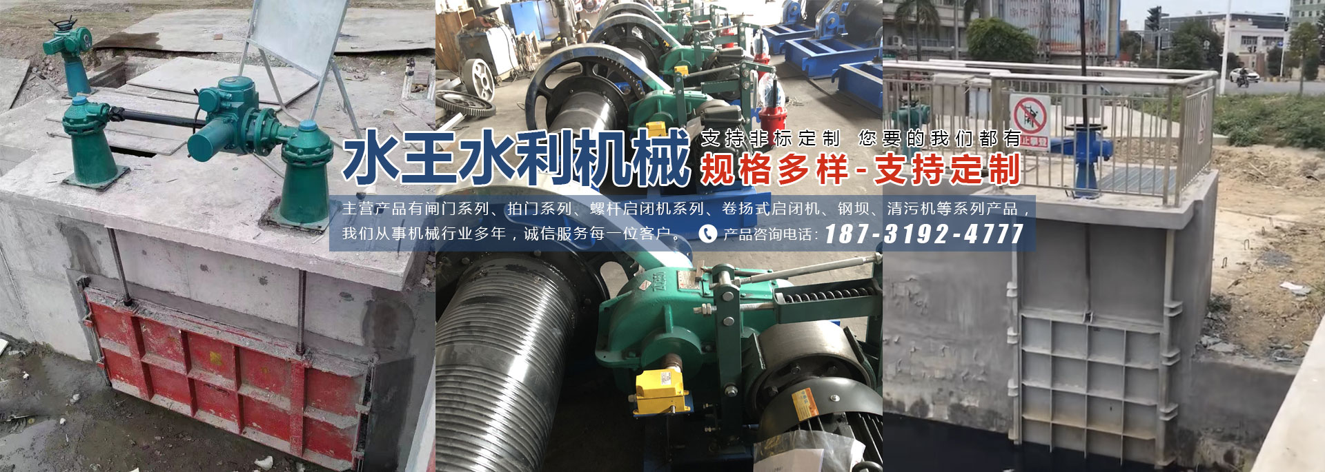 河北水王水利機械有限公司專業生產銷售鑄鐵閘門、啟閉機、閘門、固定卷揚啟閉機、移動卷揚啟閉機、電裝啟閉機、鑄鐵鑲銅閘門、鋼制閘門、翻板閘門、不銹鋼閘門、景觀壩、鋼壩、液壓翻板閘門、鑄鐵拍門、鋼制拍門等各種材質拍門、橡膠止水的專業制造、生產及指導安裝的綜合性廠家,具有現代化管理模式,產品結構合理,性能可靠,確保向客戶提供高質量的產品和周到的售后服務,是制造、銷售、安裝一體化的規模型水利工程機械生產企業。  主導產品:  1、螺桿式啟閉···